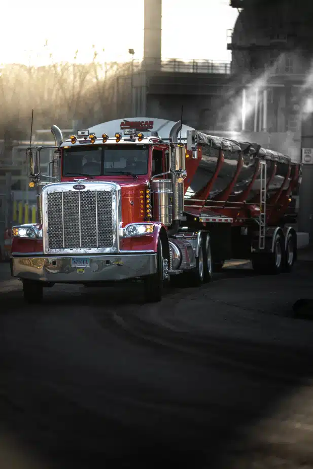 Осенью мы не снимаем брезент с кузова грузовика, кроме как во время погрузки на заводе. В остальное время мы оставляем брезент на месте, чтобы сохранить тепло в смеси по пути на объект, а также сохранить как можно больше тепла в кузове грузовика по пути обратно на завод. Допустим, между объектом и заводом 30км — если брезент снять, то в стальном кузове будет намного холоднее, когда в него загрузят следующую партию.