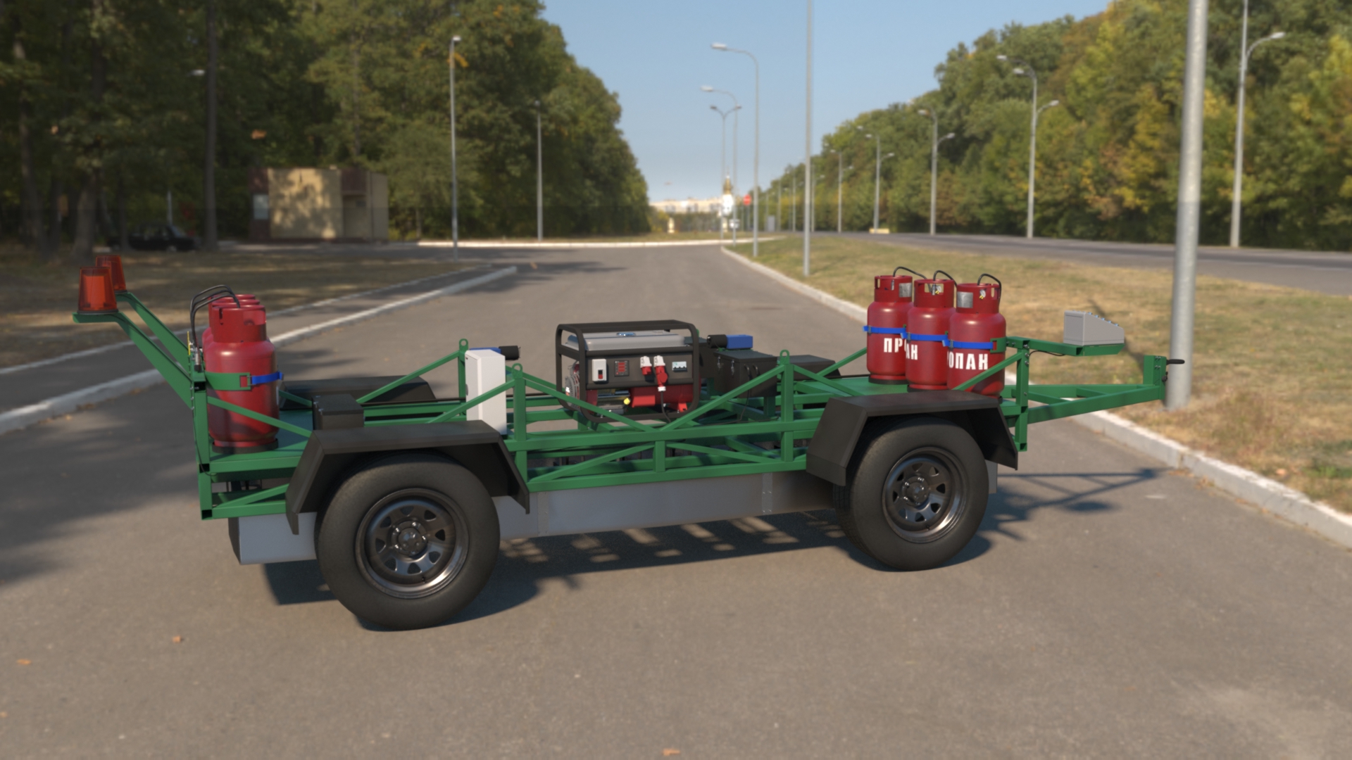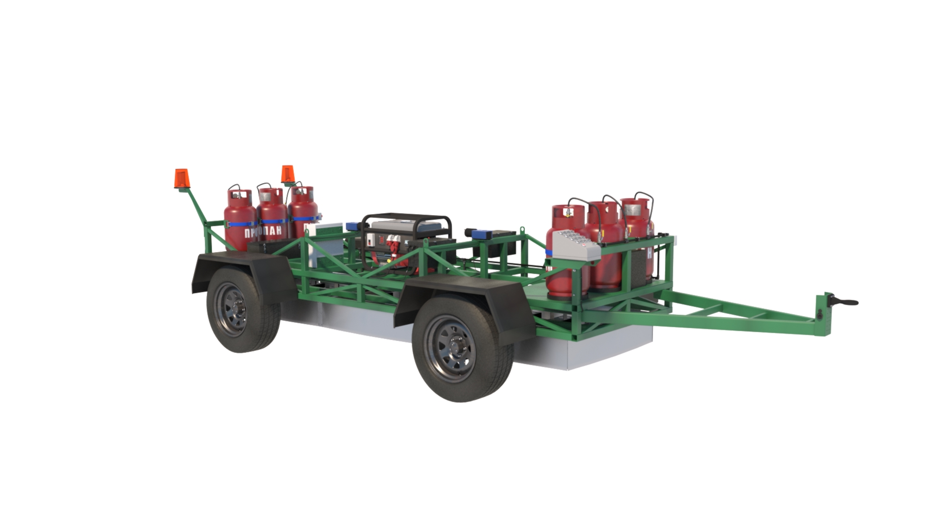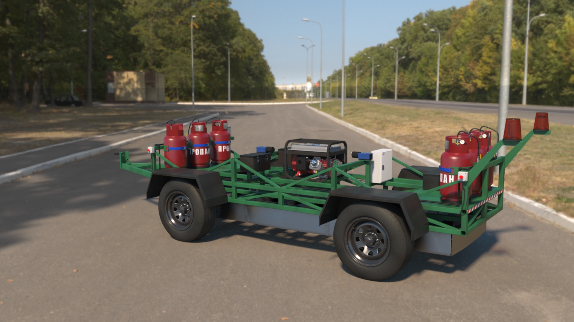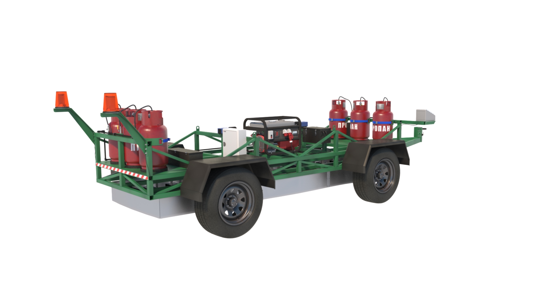 Автоматический инфракрасный датчик обеспечит многочасовую укладку термопластика с использованием 6-ти 27-ми литровых баллонов с пропаном, генератор Honda мощностью 3000 Вт и три 12-вольтовые аккумуляторы глубокого цикла.